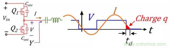 这是因为如果电流I是滞后与电压V的,这样在Q1开启之前电流I为负值就会charge Q2的Coss,同时discharge Q1的Coss,让V到Vin,这样Q1就实现ZVS turn on了。Q2开启之前,电流I为正,也会discharge Q2的Coss,和charge Q1的Coss,让V到0,这样Q2就实现ZVS了。