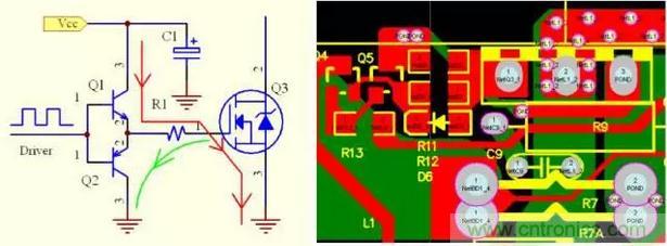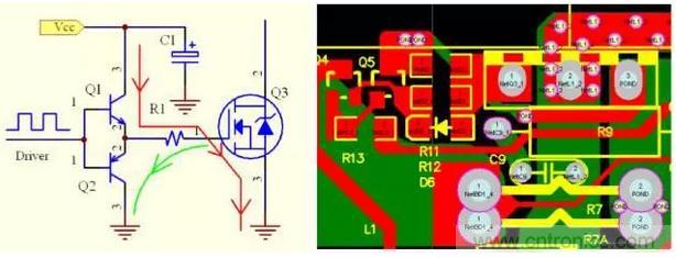 驱动源的地线要尽量靠近被驱动器件,以便 构成最小环路,减少振荡与EMI问题
