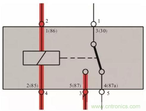 五脚继电器工作原理与四脚继电器基本相同,只是在继电器不工作的时候有一触点一直处于常闭状态。如下图所示,当继电器线圈85#和86#端子通电后,线圈吸引触点从87a#端子运动到87#端子,使30#端子与87#端子接通,所以五脚继电器也叫做枢纽继电器,可以起到一个转换的功能。