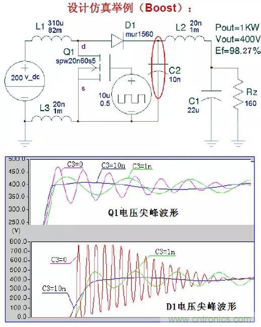 将开关管Q1、拓扑续流二极管D1和一个无损的拓扑电容C2组成一个在布线上尽可能简短的吸收回路。