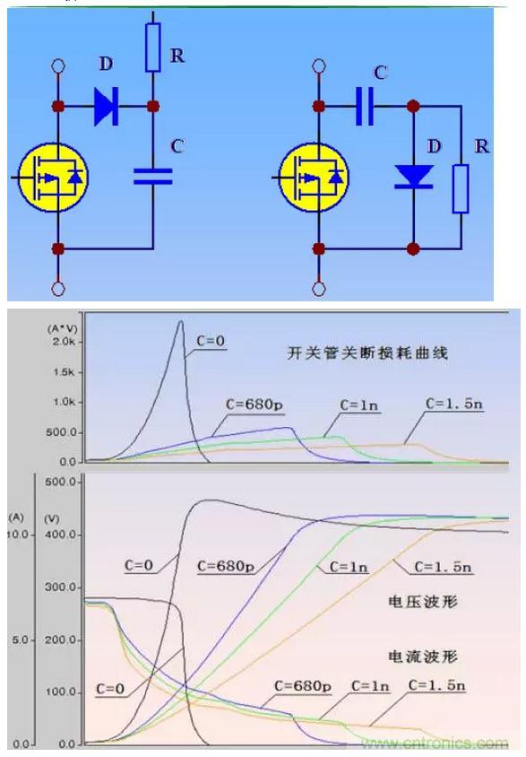 C 的大小决定吸收效果(电压尖峰),同时决定了吸收功率(即R的热功率)。