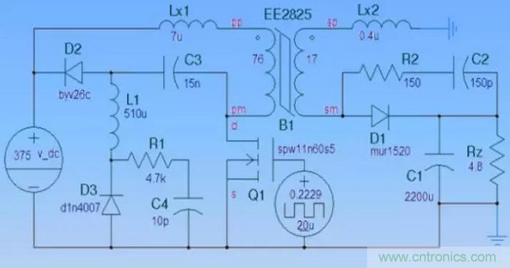 同时将Q1、D1的电压尖峰、振铃减少到最低程度。