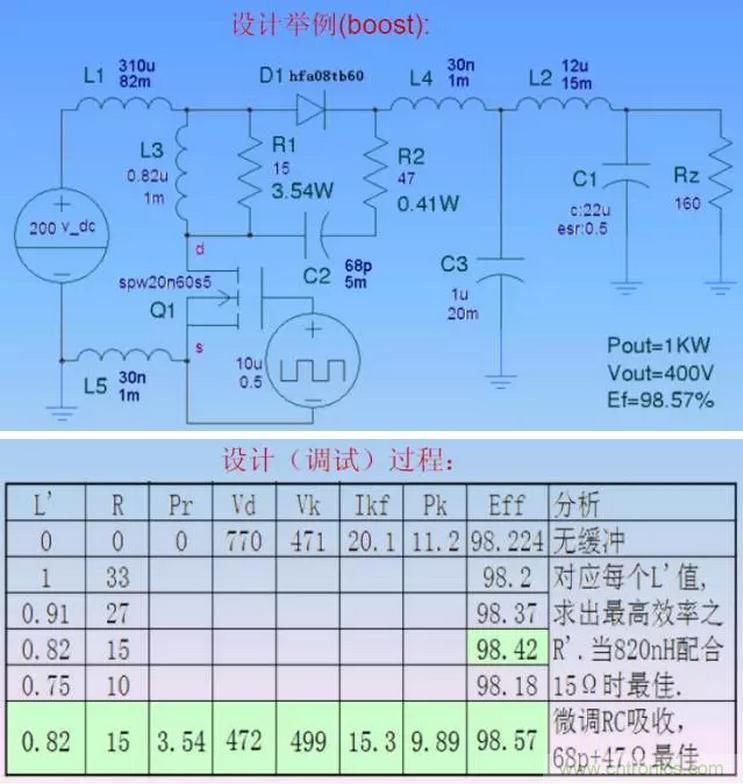 RC吸收的设计方法的难点在于:吸收与太多因素有关,比如漏感、绕组结构、分布电感电容、器件等效电感电容、电流、电压、功率等级、di/dt、dv/dt、频率、二极管反向恢复特性等等。而且其中某些因素是很难获得准确的设计参数的。