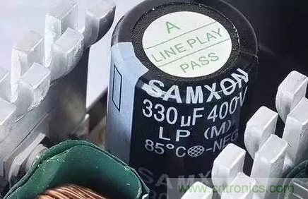 电源采用主动式PFC,因此使用容量为330μF的高压滤波电容就能满足需求。该电容的耐压值为400V,耐温值为85℃。