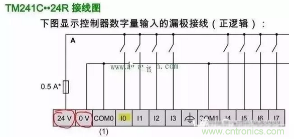 如图三所示,这是PLC 的硬件手册,我们要想把接近开关的信号接到输入点I0上,也就是黄色荧光笔部分,该怎么办呢?其实很简单,看红色圆圈的部分,PLC已经为我们提供了输出电源,我们只需把接近开关的三根线依次接上即可