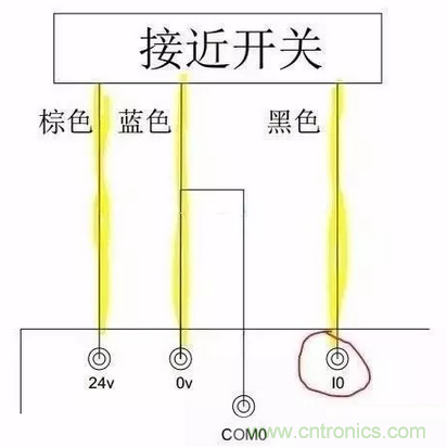 如图三所示,这是PLC 的实际接线,黄色荧光笔标识的是接近开关的三根接线,棕色和蓝色分别接到PLC 的24V和0V上,黑色接到I0上。当有物体到达接近开关的感应距离时,PLC的I0便会有输入,我们在程序里就可以做处理。需要注意的是,图中0V和COM0短接,因此,这种接法适合PNP型的接近开关。而NPN型的接近开关按此接法,是不会有任何信号的。接近开关的接线只和NPN,PNP类型有关和感性 容性无任何关系。