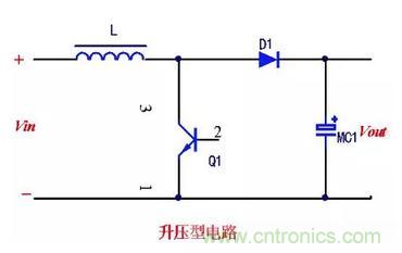 如下图为极性反转型电路,也叫倒置型电路。当Q1导通时,uin加在l两端,产生电流和储存能量。Q1截止后,l上的电流经二极管D1给电容器MC1充电。由此产生与输人电压极性相反的输出电压。