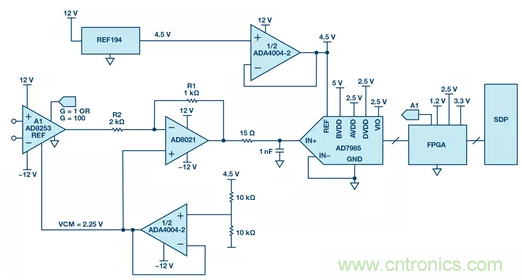 图1中的电路显示了带有2.5MSPS和上游可编程仪表放大器的16位SAR转换器,它将增益设置为1或100。通过在FPGA中进行过采样和数字信号处理,该电路可实现大于125dB的动态范围,并且仍然非常安静。高动态范围是通过AD8253的自动切换和过采样实现的,其中信号的采样速率远高于奈奎斯特频率。