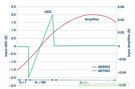 除模拟路径中的组件外,FPGA(或处理器)对电路性能也很重要。关键任务是将仪表放大器的增益从1切换为100。为此,对许多阈值进行了编程以确保ADC不饱和。因此,AD8253在输入电压高达20mV左右时以100为增益运行,这使得ADC输入端的最大电压达2.0V。然后,FPGA将AD8253的增益降至1且没有延迟,以防止过载(见图3)。