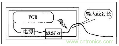 许多设备的电源线进入机箱后,经过很长的导线才接到滤波器的输入端。例如,电源线从机箱后面板输入,走行到前面板的电源开关,又回到后面板接到滤波器?;蛘呗瞬ㄆ鞯陌沧拔恢镁嗬氲缭聪呷肟诮显?,造成引线太长(如图1所示)。