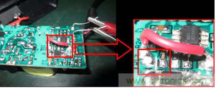 通过断开PCB铜箔使用一根导线连到输出电容地,隔开ME4312B芯片地,如下图: