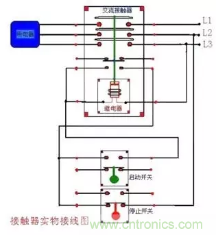 首先电源三相分别接接触器的主触点L1,L2,L3,再从接触器的T1,T2,T3接出三根线接电机的三个接线柱,以上是主电路。