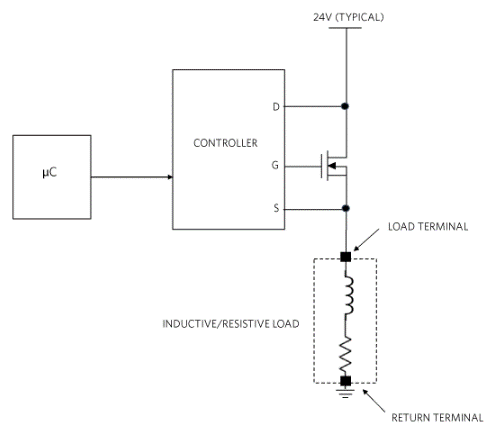 打开/关闭接地连接负载的晶体管通常被称为“高端开关”,因为它用于将电流从“高”电压轨(在工业应用中通常为24V)传导到连接到较低电压(通常为0V)的负载。这种类型的布置需要一个在饱和区域工作的n沟道FET(图2)。低电压开/关信号从微控制器发送到开关控制器 IC,然后根据需要提供打开和关闭开关所需的更高栅极电压。这些简单的电路有时也称为“数字输出”,通常用于工业执行器中,以打开/关闭阀门,为电磁阀通电和电机制动。