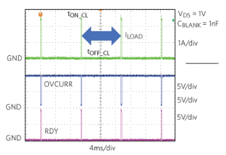 在大约 50 个“消隐时间”间隔(或 10ms)的关断延迟后,开关再次自动开启(图 5),并且此“自动重试”循环无限期重复,直到故障得到解决。
