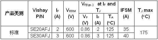 导读:Vishay近日推出新款通过AEC-Q101认证并具有ESD保护的600V标准整流器SE20AFJ和SE30AFJ。该款高电流密度器件通过AEC-Q101认证,具有高达3A的正向电流。