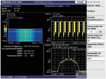 政府规定要求控制发射信号的功率、频率、带宽。这些规定防止有害干扰并保证每个发射者都是频带内其他用户的友好邻居。对于许多频谱分析仪特别是通常用于脉冲信号能量测量的扫频频谱分析仪,进行此类测量是具有挑战性的。RTSA 能够分析一个完整的分组发射过程的能量特点,也能直接测量跳频信号的载波频率,而无需将信号置于一个跨度的中心。按一下按键,分析仪就能识别一个瞬时 RFID 信号的调制方式并能够对功率、频率和带宽进行监管测量,使预一致性(pre-compliance)测试过程变得非常灵活和方便 [参阅图2]。预一致性测试有助于确保产品一次通过一致性测试,而无需重新设计和重新测试。
