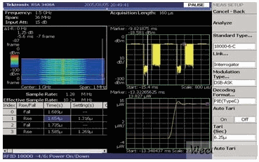 预编程测量能减少进行这些测试所需的建立时间。例如,ISO18000-6 C 类型的一个重要测量是启动时间和关闭时间。载波能量上升时间必须足够快以保证标签采集到使其正常工作的充足能量。信号也必须迅速达到稳定状态。发射结束时,载波能量下降时间必须足够快,以防止其他发射受到干扰 [参阅图3]。