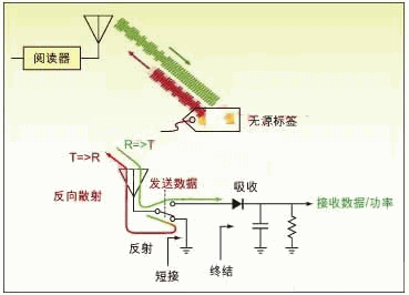 图1:无源标签对射频 RF能量进行整流并调制信号,然后反向散射反射给阅读器。