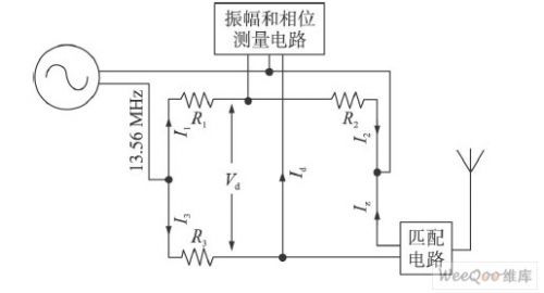 (1)测量电桥 用来测试天线的反射系数。主体部分为惠斯通电路,如图4所示。其电路中的直流电源用波形产生器替代,用来生成13. 56 MHz的正弦载波信号。其中电阻R1、R2、R3 都为50 Ω。
