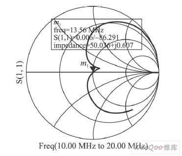 在载波频率为13. 56 MHz时,通过在TX1 和TX2 两点测量天线线路的反射系数(即参数S11 )来手动调谐,直到天线电路的输入阻抗达到目标,计算方程如下: