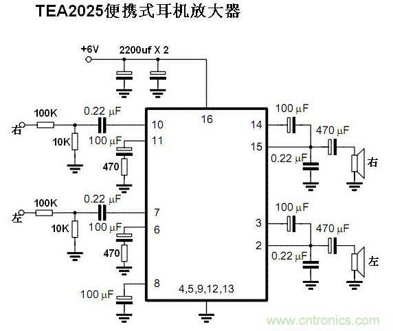 3,TEA2025使用手册上推荐的线路,是作为小型功率放大器的应用,电压增益高达52分贝,不适合直接做耳放。我在它的第6,第11脚对地串入了470欧姆的电阻以降低增益。