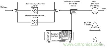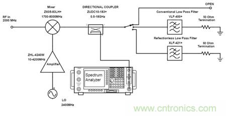 以下将组成测试电路对比传统滤波器和无反射式滤波器分别配对相同混频器的性能。