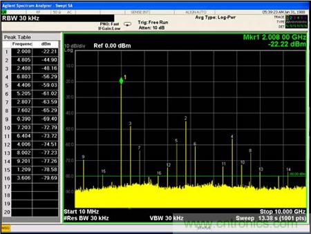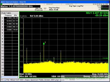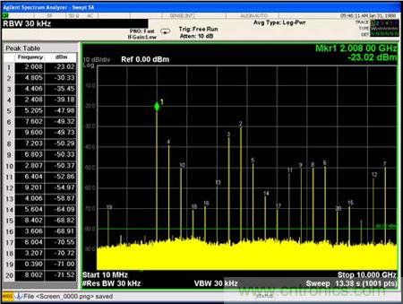 依照图7所示测试电路,将测试3种不同状态下从混频器反射到源端的信号频谱: