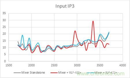 同样的,在IP3的测试曲线也显示了混频器输出端配对传统滤波器后导致的不稳定曲线。而使用无反射式滤波器配对混频器的输出端则使得IP3性能与混频器本身的IP3性能保持一致。