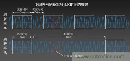 死区时间指的是示波器对采样存储回来的数字信号进行测量运算,显示等处理的过程。其中死区时间内示波器不进行采集。