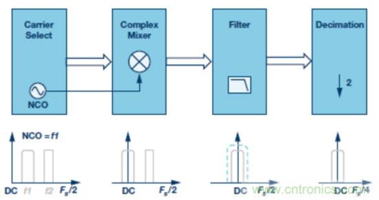 为了从干扰(阻塞信号和其他载波)中选择所需的载波,NCO的输出频率与输入中频信号混频以将所需载波频移到DC。这样可以降低后续滤波和抽取级的复杂度。