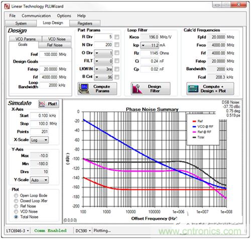 我们选择由 LTC6946-3 产生 4GHz 输出信号,并使用PLLWizard™软件工具来确定,建立 LTC6946 周边电路所需的滤波器组件值。PLLWizard 是一款免费工具,通过www.linear.com.cn/pllwizard提供,以辅助 LTC6946 的设计和仿真。