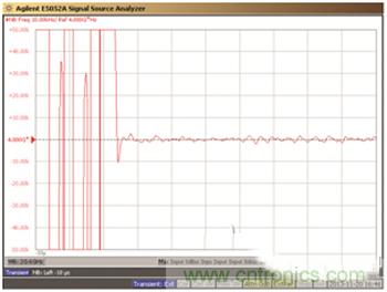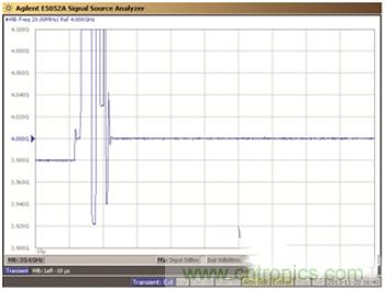 现在,我们来检查一下,从 3.98GHz到 4.00GHz阶跃 20MHz 之后,LTC6946 的输出稳定到与最终频率值相差 10kHz 以内有多快。E5052A 可捕捉瞬态响应,如图 3 所示。