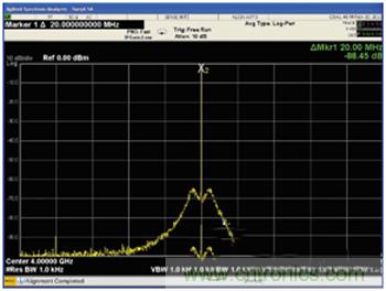我们已经评估了我们的快速稳定合成器的相位噪声行为。然而,考虑到我们已经使环路带宽相对较大,所以有人可能会问,寄生性能会受到怎样的影响。有人可能会预期,使用典型的合成器 IC 时,寄生性能在这些条件下会受到损害。使用 LTC6946 时情况却不是这样的。在 2MHz 环路带宽和 20MHz fPFD时,实现接近-90dBc 的基准杂散噪声 (从 4GHz 载波偏移fPFD = 20MHz时不想要的信号) 是引人注目的,正如图 5 显示的 LTC6946 频谱所确认的那样。