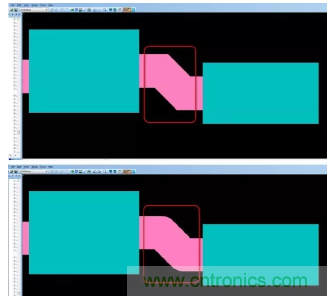 射频和微波电路中经常用到倒角,以减小供给线与电容之间的分段不连续性阻抗,从而改善 MMIC 的频率性能。90º拐角与倒角之间的距离至关重要。因此,设计人员需要采用自动方法来基于设计指定需要产生的倒角比率。PCB设计工具如果能够基于设计规则自动强制实施需要产生的倒角比率,设计人员和工程师将会从中受益,在节省时间的同时提高设计质量(图 3)。