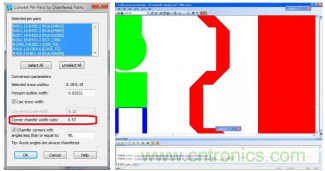设计用于射频和微波的铜箔形状时,一个很重要的方面是能够建立带尖拐角的 Gerber檔。优秀的PCB设计工具可以简化这一过程。例如,使用50毫米线条绘制形状与使用50毫米圆形光圈绘图相比,往往令设计具有较小的半径。设计工具在建立Gerber档时,可透过正确地自动转换线条宽度来获得尖拐角(图 2)。