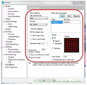 射频设计的另一个重要方面是确保正确地利用vias屏蔽特定的区域。尽管此任务可由设计人员手动进行,但这个过程极其耗时。如果PCB设计工具能够自动完成此过程,将可以缩短设计周期时间并确保符合您的所有设计规则。利用此类工具,设计人员可以指定via模式产生特定规则,而将剩余的工作全部交由PCB设计工具完成。