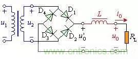 桥式整流电感滤波电路如图2所示。电感滤波的波形图如图2所示。根据电感的特点,当输出电流发生变化时,L中将感应出一个反电势,使整流管的导电角增大,其方向将阻止电流发生变化。