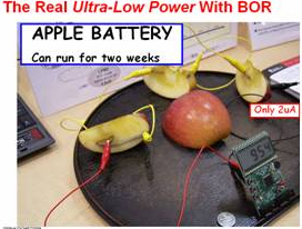 低功耗:便携化就意味着产品将对待机时间提出更多需求。在CMET2009上,来自TI的 MSP430微控制器业务发展经历刁勇展示了MSP430家族令人吃惊的功耗特征:仅仅用三小块苹果制成的生物电池就可以带动MSP430正常工作一到两个星期!
