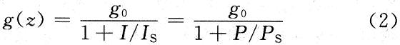 式中:g0是由泵浦强度定的小信号增益系数,由于增益饱和现象,随着信号功率的增加,增益系数下降;Is,Ps分别为饱和光强和饱和光功率,是表明增益物质特性的量,与掺杂系数、荧光时间和跃迁截面有关。