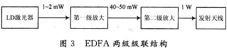 EDFA对光信号功率的放大,特别在无线光通信大功率(瓦级)应用中,常常采用级联的方式,比如两级或者三级放大。之所以采用级联的方式,是因为在EDFA的掺铒光纤(EDF)中插入一个光隔离器,构成带光隔离器的两段级联EDFA,由于光隔离器有效地抑制了第二段:EDF的反向自发辐射(ASE),使其不能进入第一段EDF,减少了泵浦功率在反向ASE上的消耗,使泵浦光子更有效地转换成信号光能量,从而可以明显改善EDFA的增益、噪声系数和输出功率等特性。本文采用丽级级联放大,将1~2mW的1550nm光信号,经EDFA放大到1W左右。级联结构如图3所示。