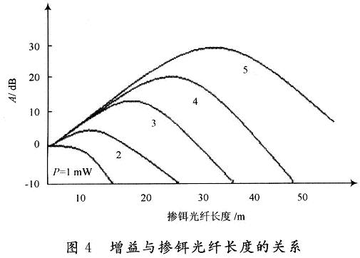 由于掺铒光纤本身的损耗,造成信号光中被吸收掉的光子多于受激辐射产生的光子,引起增益下降。由上述讨论可知,对于某个确定的入射泵浦功率,存在着一个掺铒光纤的最佳长度,使得增益最大。增益与掺铒光纤长度的关系如图4所示。