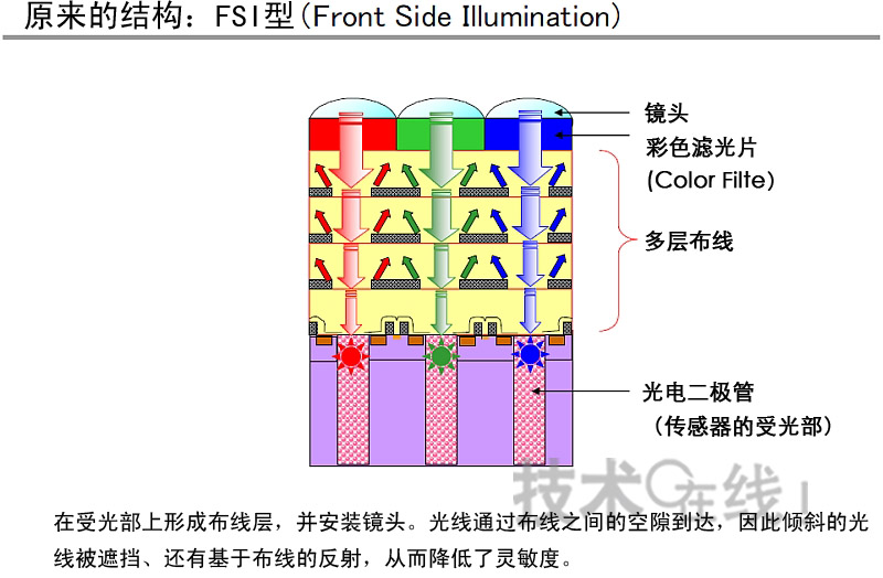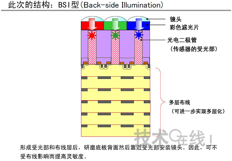 在BSI型CMOS传感器中,可通过采用传感器上面没有布线层的结构来提高采光率。研磨形成传感器的硅底板,然后将镜头靠近传感器安装。此项工序采用了晶圆薄化和接合等大量面向MEMS使用的工艺技术。由于没有妨碍光线入射的布线层,因此可提高灵敏度。东芝表示,若是已宣布量产的1.4μm产品,则可将灵敏度提高约40%。另外,该元件的光学格式为1/2.3英寸,帧速率为60?。耄ㄖС?080p以及720p)。