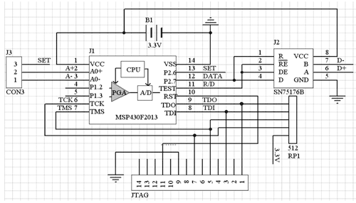 本文介绍的单片传感信号接口设计采用了德州仪器公司新近推出的一款多功能的微控制器MSP430F2013,它内部集成了16位的Σ-ΔADC。2kb的程序空间和128b的数据存储空间,可以完成数据的智能采集,并采用差分传输方式进行数据的传输。数据按帧进行传输,传输过程中采用CRC检验进行差错控制。