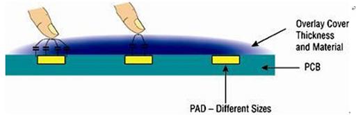 下面的简化公式表明了手指逼近对触摸垫片电容产生的主要影响。这个公式可用于确定传感器垫片的电容和强度。