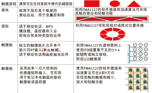 相对于传统机械按钮、滑块、转轮和开关,触摸传感器控制提供了灵活、可靠且高性价比的替代方案。最新的触摸传感器为设计者发挥其创造性创造了条件,设计者在开发接口时可隐藏或露出按钮、或采用其他形态触摸板的模式。表2和图4显示了不同的传感器形状和应用。