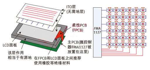 图5:使用FMA1127实现的触摸屏及PCB和触摸屏的叠层安排。利用TDC比较由检测电容形成RC延时线与基准RC延时线的延时差别。使用差动信号消除或降低了相关/相干噪声源的影响,无需地层。