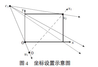 假设虚拟触摸屏是如图4所示的矩形区域,以左下角为原点,建立二维坐标平面x、y。左边摄像头c1位于虚拟触摸屏左上角某处,其视角范围应包含整个矩阵区域,将c1与矩形的4个顶点连接构成摄像头拍摄各点的光线方向,以经过左下角和右上角顶点的光线方向为腰,c1为顶点作一个等腰三角形,底为虚线所示的(u1,u2)。当手指在矩形区域内任意一点触摸时,其在摄像头所拍摄的图像中均表现为虚线上的一点,手指在二维虚拟触摸屏上的移动投影到图像上不会超过这条虚线(u1,u2)范围,这是算法关注的兴趣区域,区域以外的部分不需要处理。因此以u1为原点沿着虚线方向建立一维坐标x1,右边摄像头拍摄图像中的一维坐标x2类似设立。