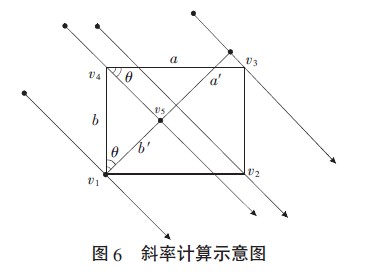 同时初始设置时可以根据虚拟触摸屏的长宽和每个棋盘格在图像上的投影确定摄像头拍摄的每个棋盘格平行光的斜率。放大图5 中的棋盘格s,得到图6。假设摄像头c1以斜率k平行拍摄由顶点v1、v2、v3、v4组成的棋盘格s,其边(v4,v3)的长度为a,在图像平面上的投影(v3,v5)的长度为a′,其边(v1,v4)的长度为b,在图像平面的投影(v1,v5)的长度为b′。已知虚拟触摸屏的长宽,每个棋盘格的长a 和宽b 分别为其1/n,a′、b′可从拍摄的图像上获得,于是从摄像头拍摄该棋盘格的平行光的斜率k 可由下式获得: