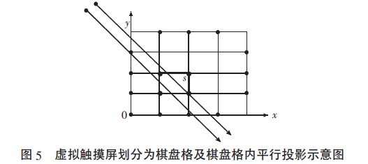 具体实施中,为准确识别手指位置,将虚拟触摸屏划分为n×n 的棋盘格,如图5 所示,由于摄像头离棋盘格距离较远,且每个棋盘格足够小,于是可以假设在棋盘格内,摄像头拍摄的光线是平行的,以简化点位置的转换。