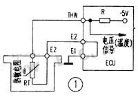 进气温度传感器的安装位置有 3 种:在 D 型 EFI 系统中,它安装在空气滤清器之后的进气软管上;在 L 型 EFI 系统中,它安装在空气流量传感器上;有的进气温度传感器安装在进气压力传感器内。进气温度传感器内部,也是一个具有负温度电阻系数的热敏电阻.外部用环氧树脂密封。进气温度传感器与 ECU 的连接电路如图 2 所示。